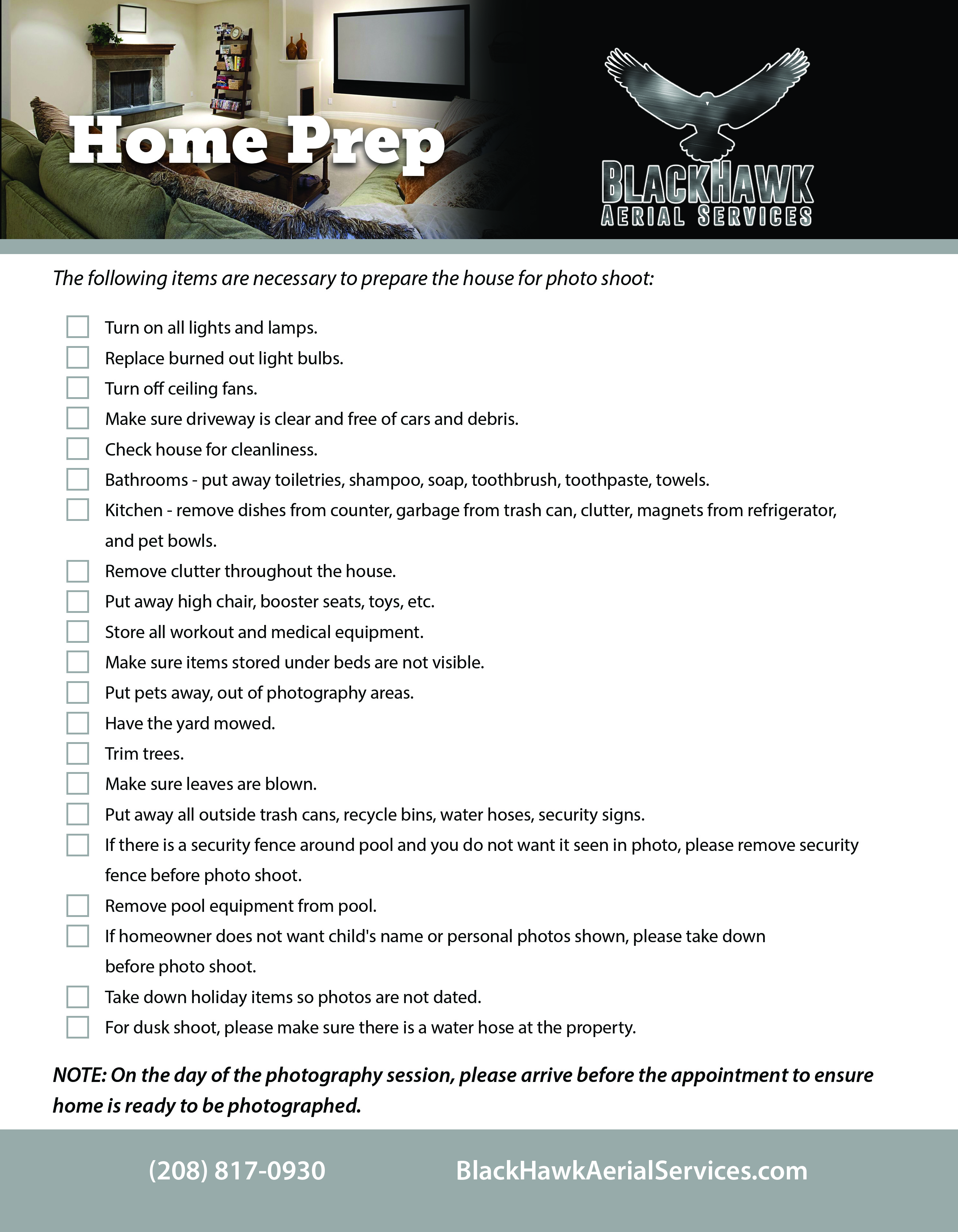 After setting an appointment with BlackHawk Aerial Services, please review the home preparation flyer to ensure your property is ready for the photo shoot. Here you will see all those requirements for photography